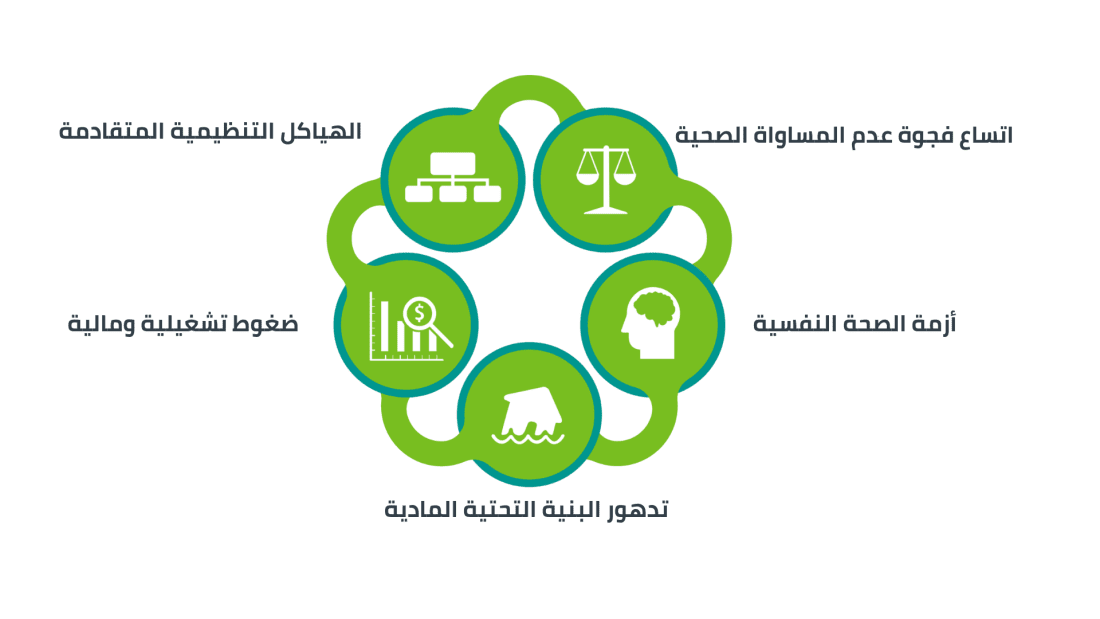 تتعرض أنظمة الرعاية الصحية لضغوط مستمرة نتيجة لدورات التمويل قصيرة المدى، القيود على الطاقة الاستيعابية، الطلب المتزايد، مما يحد من قدرتها على التكيف أو الاستثمار للمستقبل. في الوقت نفسه، تبطئ الهياكل الهرمية الصارمة وآليات اتخاذ القرار التغيير إلا إذا فرضت أزمة ضرورة التحرك