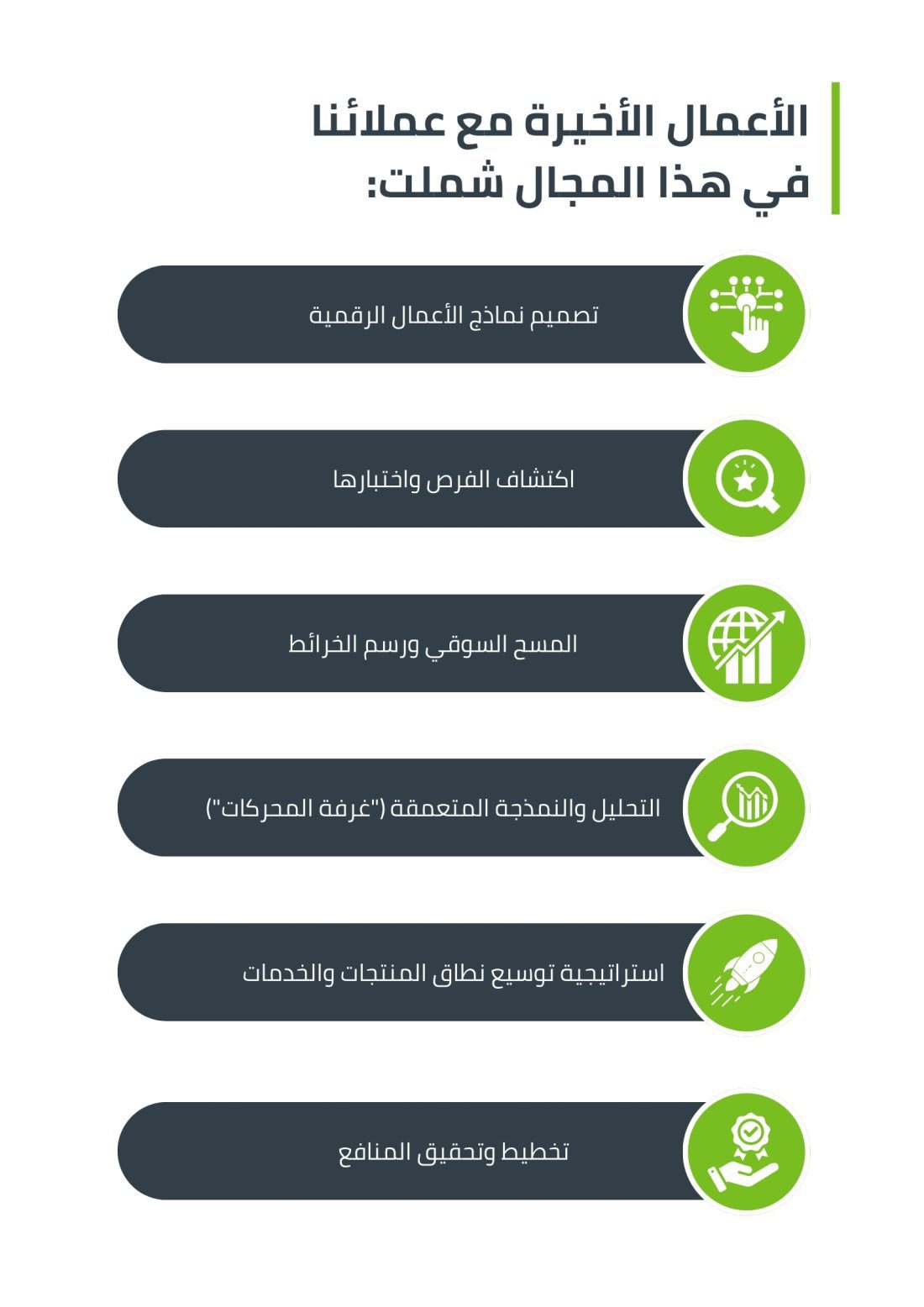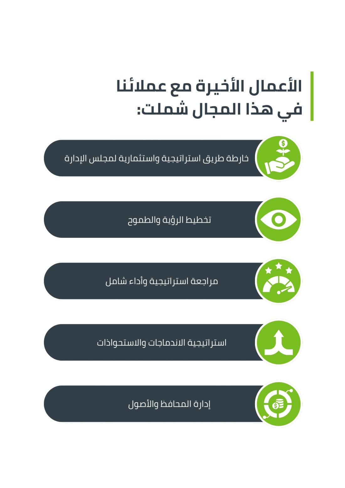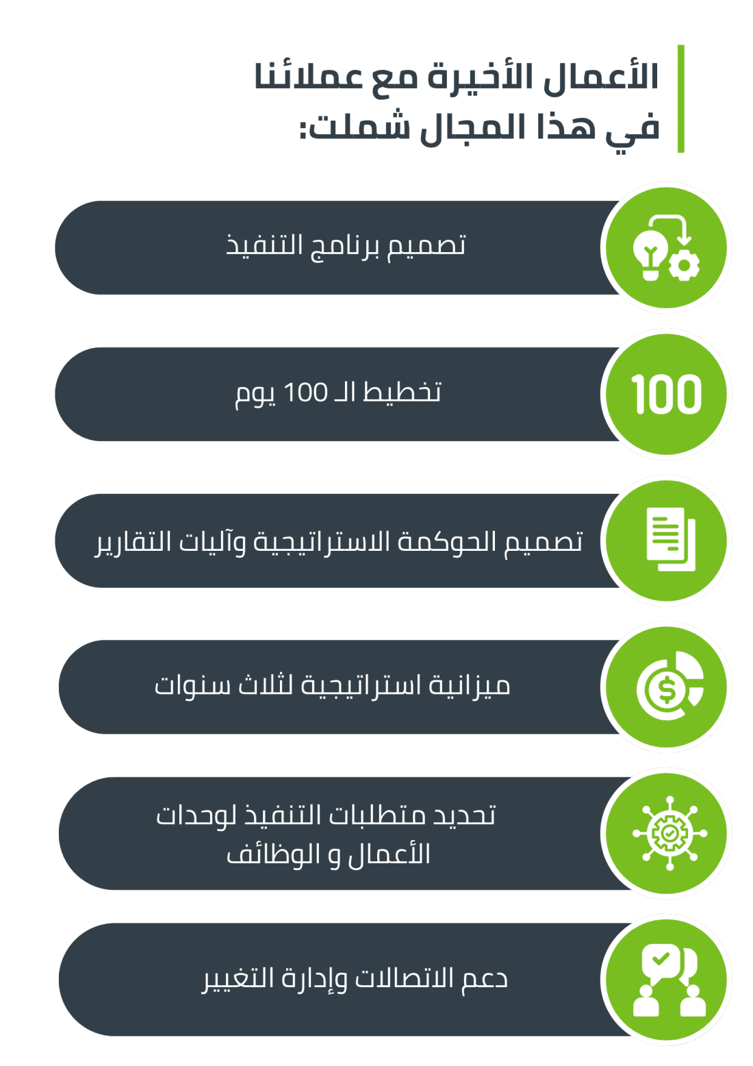 من دون تنفيذ دقيق وملتزم، حتى أفضل الاستراتيجيات تظل بلا قيمة. لذلك نعمل عن قرب مع قياداتكم وفرق العمل لتحويل الاستراتيجية إلى واقع عملي، عبر توضيح دور كل قطاع أساسي في تحقيق الأهداف الاستراتيجية